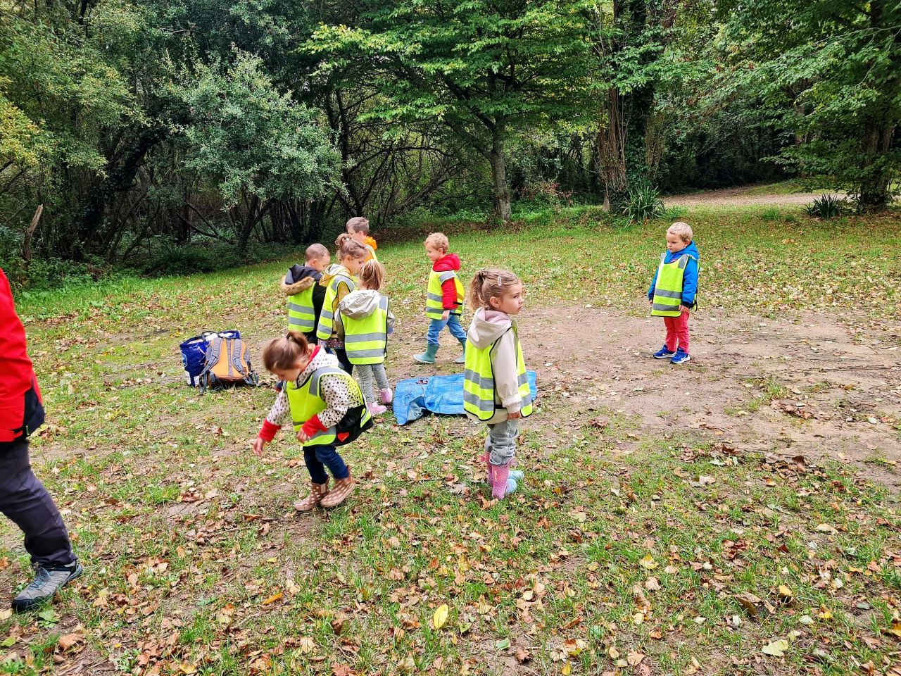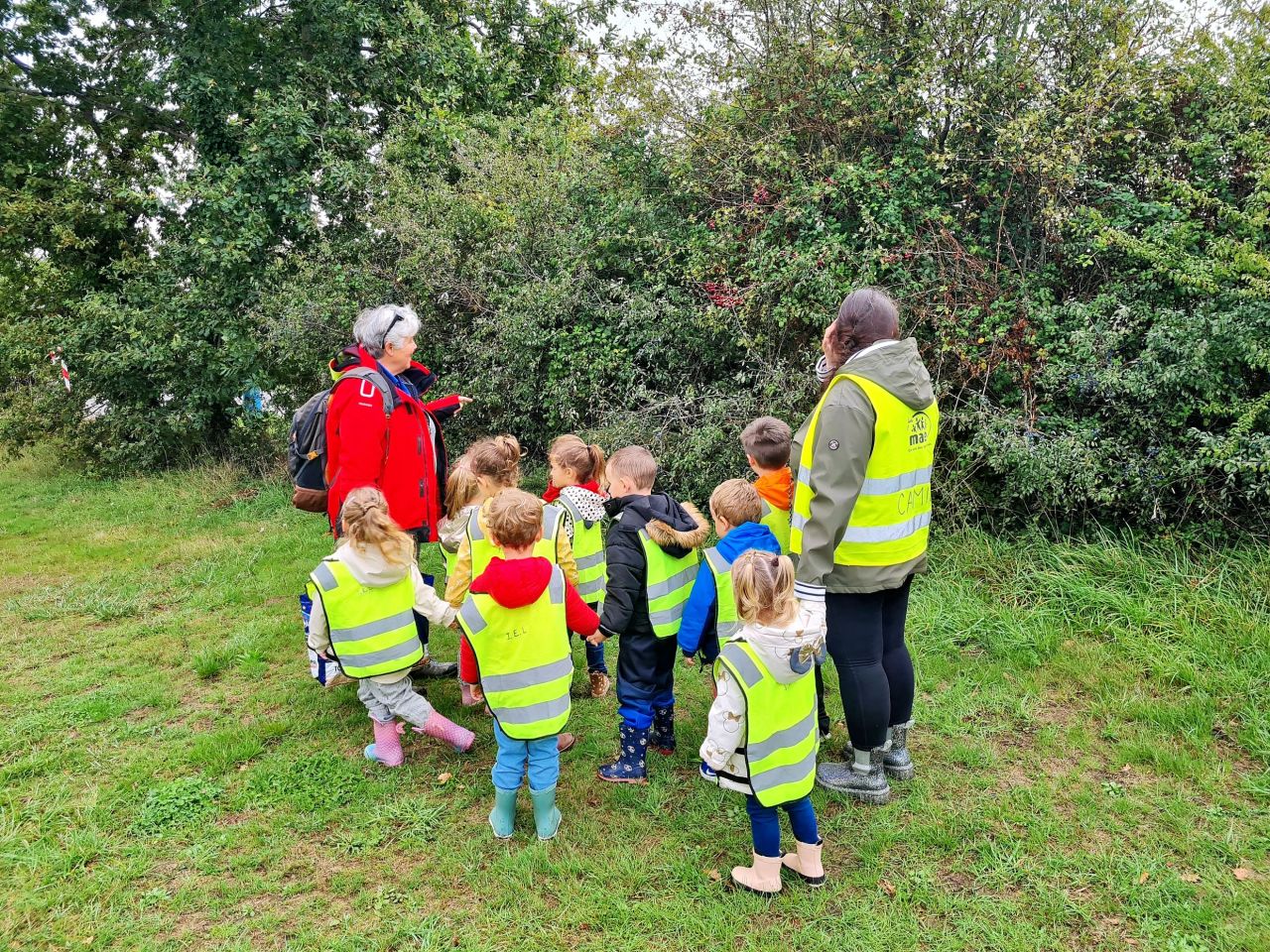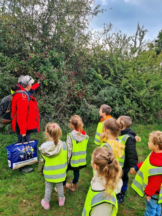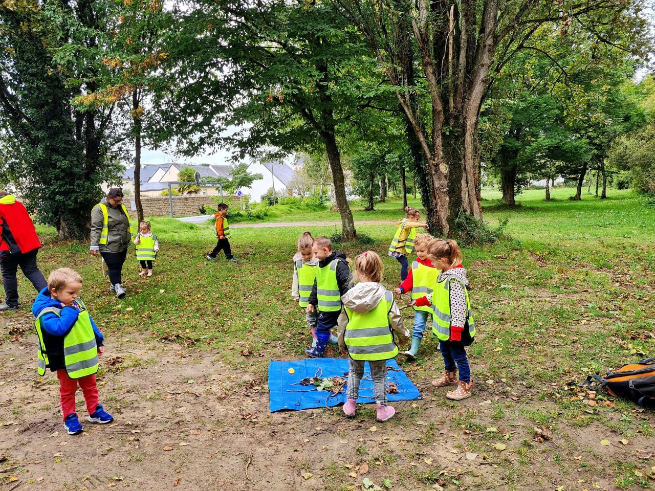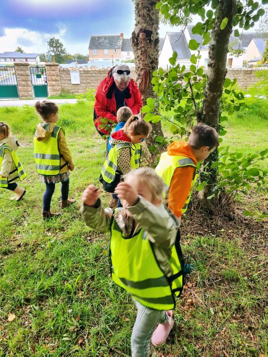C'est au tour des maternelles CP de sortir accompagnés de Maryline du CPIE Loire Océane pour observer les arbres qui nous entourent . Ils ont pu observer les formes de différents arbres , toucher les écorces , la mousse sur les troncs , ramasser des fruits , des graines .